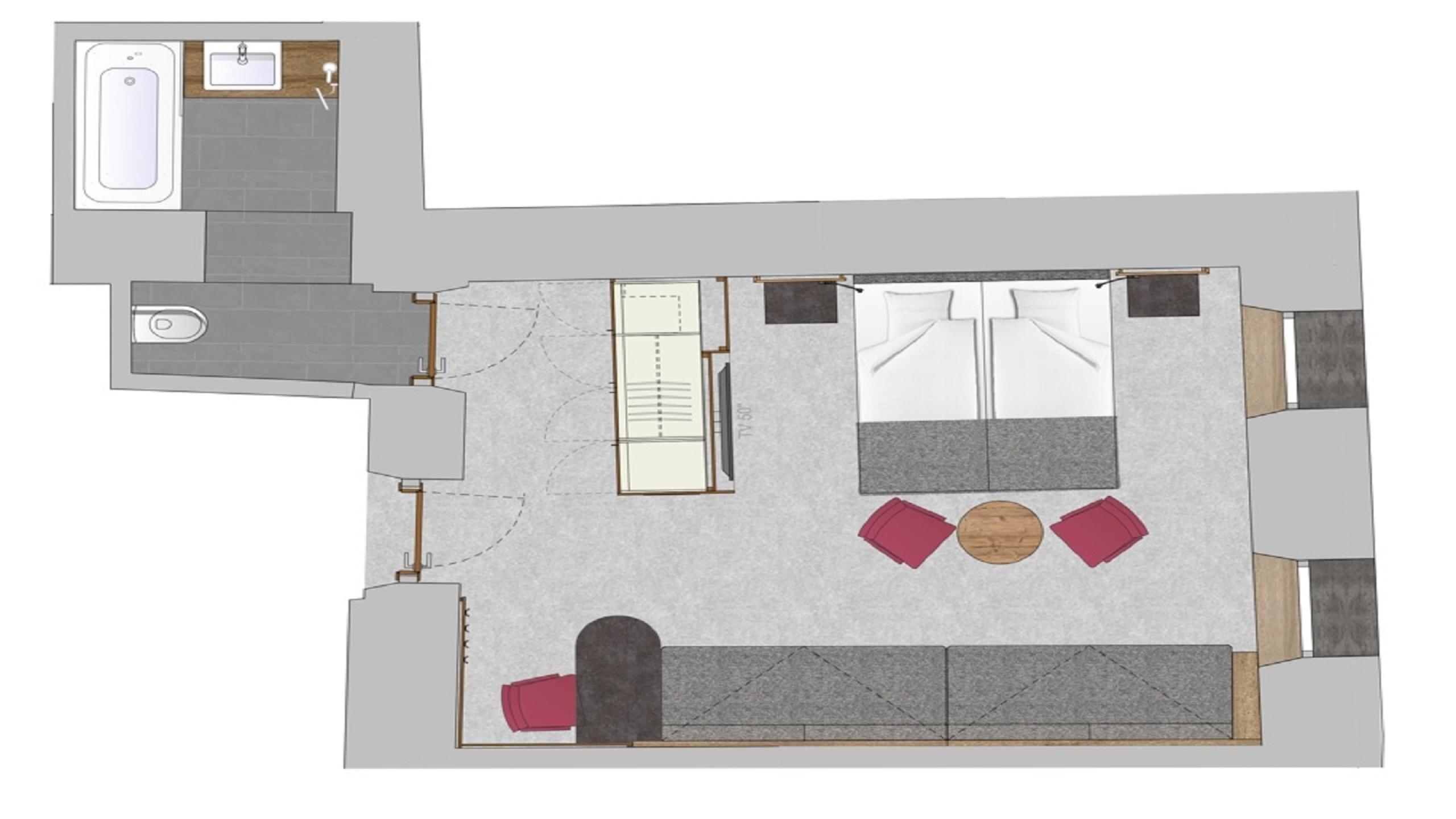 The room has a bath, WC, mini bar, hair-dryer, bathrobes, Flat-TV, safe and WiFi. Only accessible via stairs